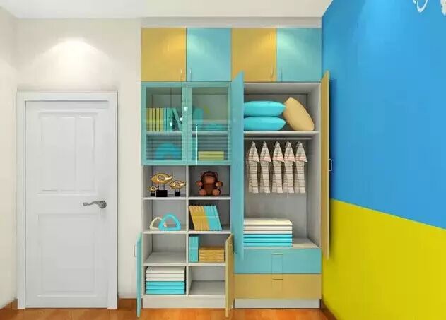 凹位處做一個書櫃與衣櫃的組合,黃藍搭配,給人溫馨、清爽的感覺。